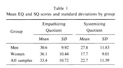 The empathizing and systematizing idea was first investigated by Simon Baron-Cohen as part of his work on autism. It was developed a lot by various researchers over the years, but the original intent was really to see if people with autism were deficient in empathy in some way and if that could help classify the disorder. Typically empathizing and systematizing are measured by giving two different tests, one for each, and then assigning you an “EQ” score and an “SQ” score. For a lot of Cohen-Baron’s work he then subtracts one from the other to figure out your gap between the two.
