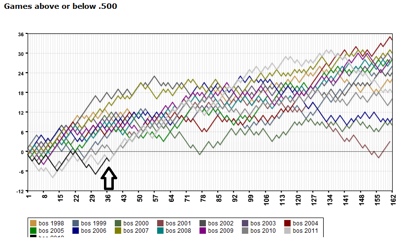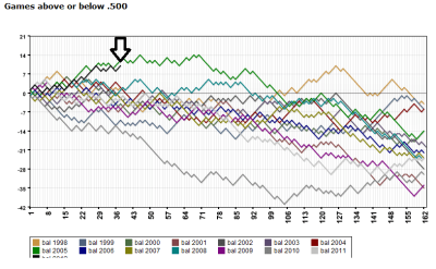 Yesterday, Grantland put up an article on the Orioles under .500 curse. Apparently they have not finished over .500 since 1997….more than enough seasons for the baseball stats guys to go nuts with. I was curious exactly how bad it was, so I looked around until I found this graph generator*.