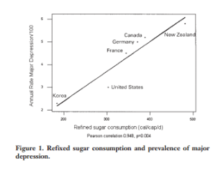 Last week reader panjoomby pointed me to an interesting study that correlated a countries sugar consumption to their rates of major depression. Apparently that gives a correlation of .948.