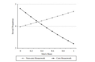 - The authors divided chores in to traditionally female (core) and traditionally male (non-core) tasks. Core tasks include meal prep, cleaning, grocery shopping, etc and non-core tasks include lawn maintenance, bill paying and driving. The finding was that the more men did the core work, the less sex the couples had, but the more non-core work they did, the more sex they had: