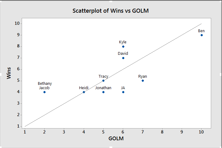 Now this shows us some interesting patterns. I checked the significance levels on these, and 7 of them actually had significant patterns (my scores, David and Jonathan’s were not significant at the .05 level). This is how I ultimately determined the rankings I sent out. Amusingly, one of our most all over the place players didn’t actually get a linear relationship as the best fitting model. I ignored that, but it made me laugh. - Games over League Median (GOLM): This is one I’m working on just for giggles. Basically it’s the number of games each player has played where they scored over the median number of points our league scores. For example, out of the 110 individual performances so far in our league this year, the median score is 133.2 I then calculated the percentage of games each team scored above that number. I was hoping to figure out something a little more accurate than just wins and losses, because of course it doesn’t matter what the league scores…only what your opponent scores. Here’s what I got: