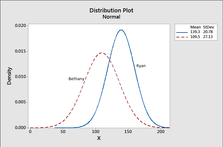 I added a line that I will dub “the line of fairness”. Basically, this is where everyone should be based on their scores. If you’re above the line, you’ve actually had a lucky season with more wins then scores over the median. If you’re below the line, you’ve had an unlucky season. On the line is a perfectly fair season. The further away from the line, the more out of range your season has been. - Normal Distribution Comparisons: This one isn’t for the overall league, but does give you a good picture of your weekly competition. I wasn’t actually sure I could do this one because I wasn’t sure my data was normally distributed, but Ryan-Joiner assured me that was an okay assumption to make in this case. Basically, I wanted to see what my chances were of beating my opponent (Ryan) this week. I wasn’t expecting much, and I didn’t get it: