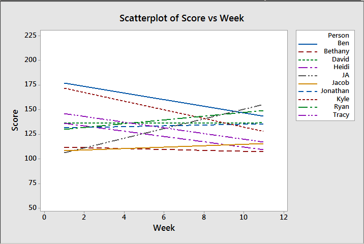 - Regression Lines/Line of Best Fit: Okay, so now that we have a good picture of the season, let’s see some trends! Because of course fantasy football, like all sports, cares a lot more about where you end than where you start. Players get injured, people have weak benches, people come back from suspensions, etc etc. By fitting a regression line we can see where everyone started and where they’re headed:
