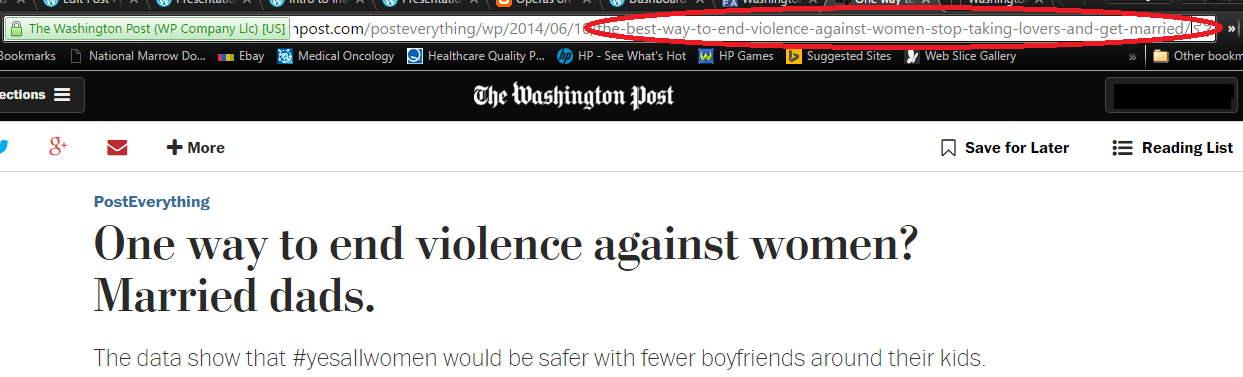 On the plus side, the internet makes it easier than ever for people to complain about headlines and actually get them fixed. For example, last year a Washington Post op-ed got published with a headline “One Way to End Violence Against Women? Stop Taking Lovers and Get Married” with a sub-headline that read “the data shows that #yesallwomen would be safer married to their baby daddies”. People were upset, and many took umbrage with the headline for giving the impression that violence against women was women’s fault. Even the author of the piece jumped in and disavowed the headlines, saying the were disappointed in the tone. The paper ended up changing the headline after admitting it was causing a distraction. Now whatever you think of this particular story, it’s a good sign that this is a type of bias you can actually do something about. It’s a really good example of a place where “see something, say something” might make a difference.