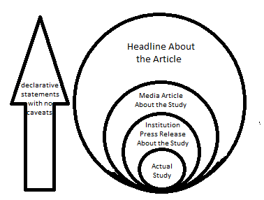 When it comes to headlines, especially ones that make claims about science or data, I think it’s important to think of this as a group of concentric circles. As you move outward, the claims get bolder, brasher, and all caveats get dropped: