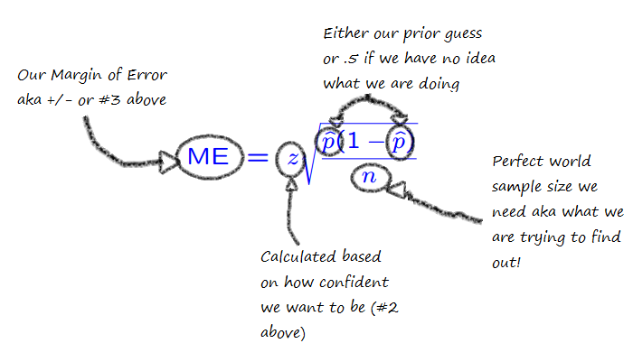 Now things get dirty. What I showed you above is basically how we’d do an estimate for each of the candidates, putting in their prior polling numbers for p one at a time. What about the other numbers though? We know we have to set our confidence high so we’re not embarrassed, but what about our margin of error? Well here’s where all those phone calls you get prior to the election help.