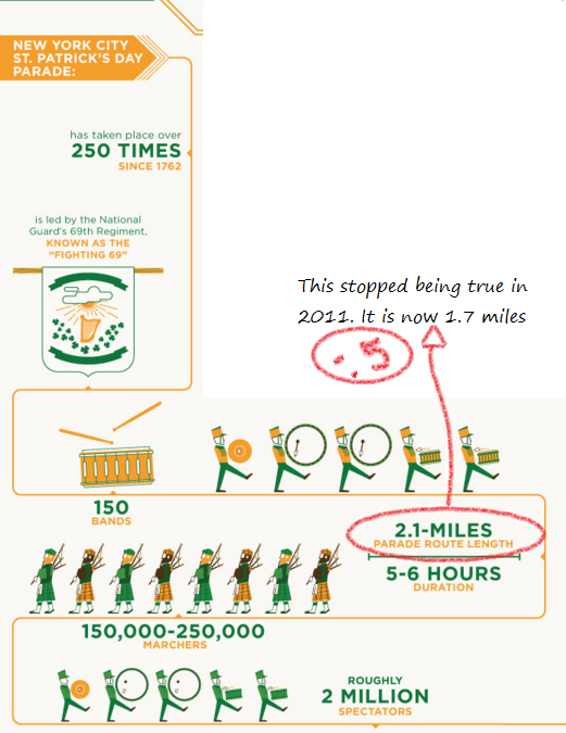 So the parade length changed in 2011, and since there’s not a date on this infographic I took half a point off. By the way….best line from the parade FAQ: “The Parade has not been cancelled due to bad weather. That said, the Parade has marched in a variety of meteorologic conditions that have included various examples of inclemency.”