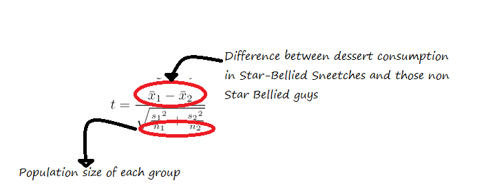 This next step can work differently depending on the experiment/sample size/lots of other details, but lets say we’re comparing Star Bellied Sneetches to those without stars on their bellies and seeing if the groups eat a different amount of dessert. After we calculated the average dessert eaten by both groups, we would calculate something called a t statistic using this equation.