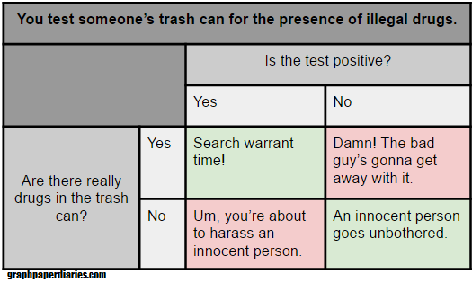 Before we go on, let’s take a step back for a minute and consider why the police department may have had to consider when they selected a drug screening test to use. It’s important to recognize that in this situation (as in most of life), you actually do have some discretion over which way you chose to be wrong. In a perfect world we’d have unlimited resources to buy a test that gets the right answer every time, but in the real world we often have to go the cheap route and consider the consequences of either type of error and make trade-offs.