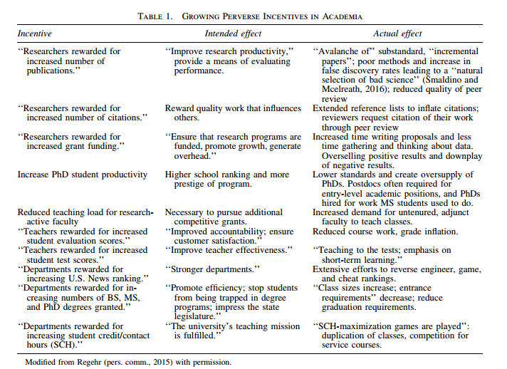 That last point is also the focus of one of the linked readings “Academic Research in the 21st Century: Maintaining Scientific Integrity in a Climate of Perverse Incentives and Hypercompetition“. The focus of this paper is on the current academic climate and its negative effect on research practices. To quote Goodhart’s law “when a measure becomes a target, it ceases to be a good measure”. It covers a lot of ground including increased reliance on performance metrics, decreased access to funding, and an oversupply of PhDs. My favorite part of the paper was this table: