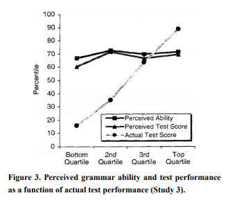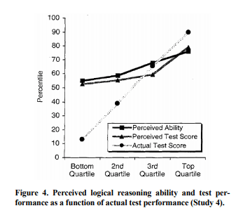 Also, in terms of generalizability, it should be noted that the participants in this study were all Cornell undergrads being ranked against each other. Those bottom quartile kids for the grammar graph are almost certainly not bottom quartile in comparison to the general population, so their overconfidence likely has at least some basis.  It’s a little like if I asked readers of this blog to rank their math skills against other readers of this blog….even the bottom of the pack is probably above average. When you’re in a self selected group like that,  your ranking mistakes may be more due to a misjudging of those around you as opposed to just an overconfidence in yourself.