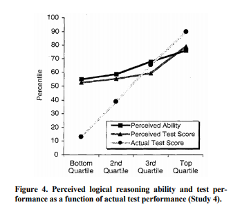 So based on the actual graphs, Dunning and Kruger did not find that the lowest quartile thought they did better than the highest quartile, they found that they just thought they were more average than they actually were. Additionally it appears the 3rd quartile (above average but not quite the top), is the group most likely to be clearsighted about their own performance.