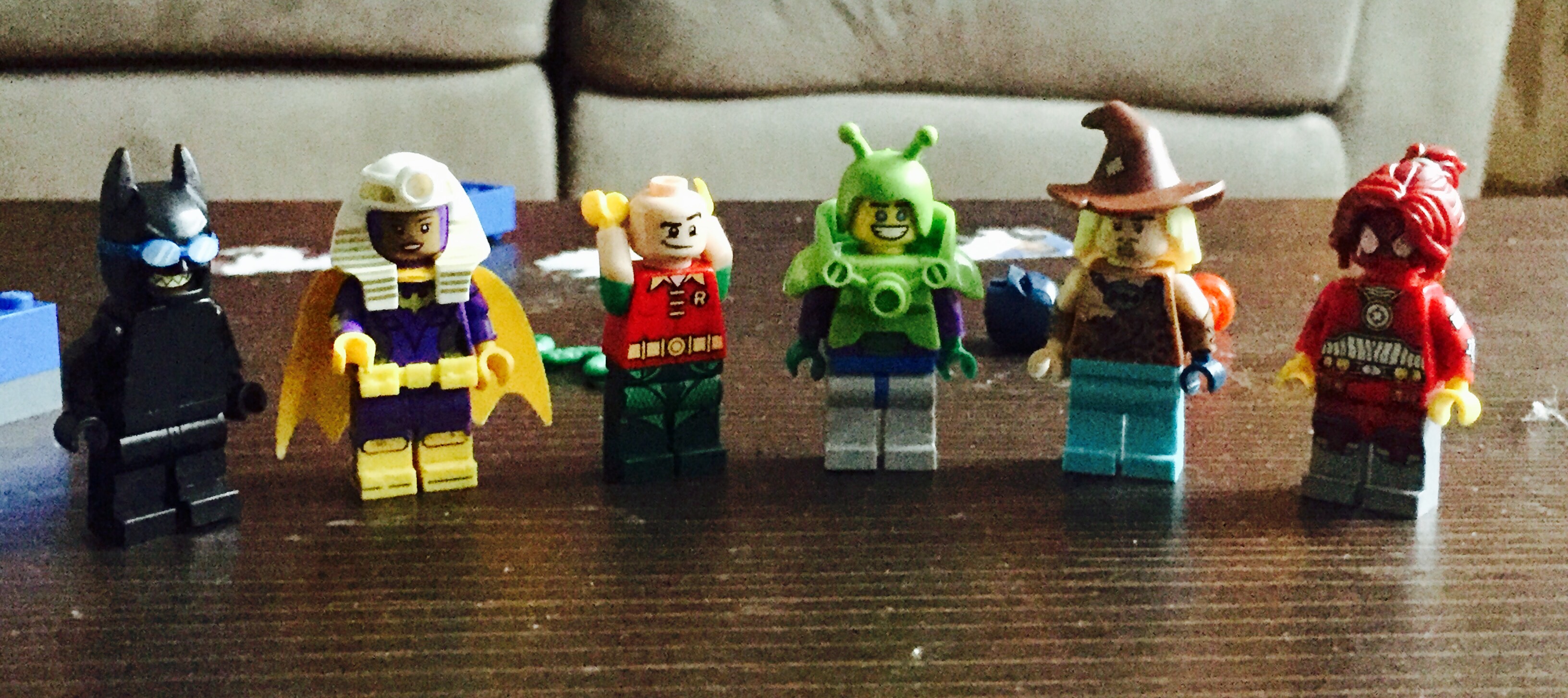 He refused to tell me their names and got shy when I asked, but from what I can put together it’s (from right to left): Joker in disguise, Queen Tut/Barbara Gordon, Robin ripping his pants off, Happy Bug Man, Caveman Scarecrow and Spidergirl.