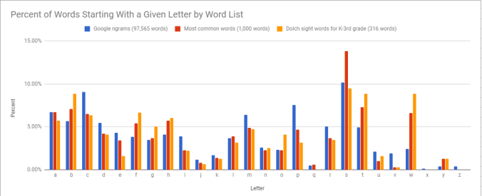 As I was defending the English language’s treatment of the letter “s”, I started to wonder what the most common first letter of words actually was. I also wondered if it was different for “kids words” vs “all words”. After some poking around on the internet, I discovered that there’s a decent amount of variation depending on what word list you go with. I decided to take a look at three lists: