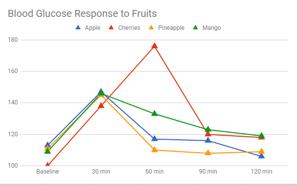 Now some results! I don’t have a ton of data yet, but I thought my haul so far was pretty interesting. Note: my fasting glucose is running a bit high, which is why I’m interested in this experiment to begin with. First, my fruit experiments:
