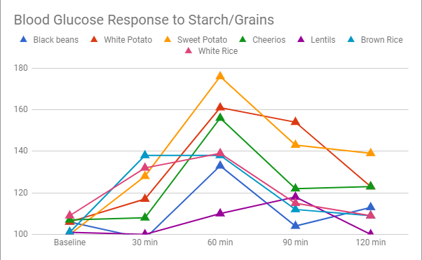 Next, my starches/grains. Note the shift of the peak from 30 minutes for fruit, to 60 minutes for most of these foods: