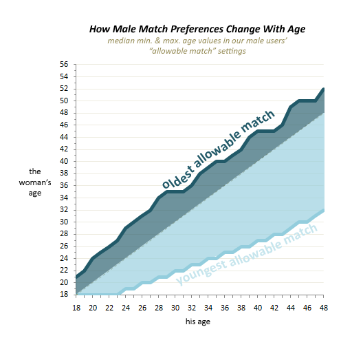 - Some of this may be up front decision making rather than personal One of the weirder downsides to online dating is the ability to set hard stops on certain characteristics of others. While in pre-computer days you would generally find out someone’s attractiveness first, now you can ask the site only to show you matches that are taller than 6’/older than 25/younger than 40, and the algorithm will do exactly what you say. This almost certainly impacts messaging behavior, and it turns out men and women approach ages limits really differently. OKCupid pulled their data on this, and here’s what they found: