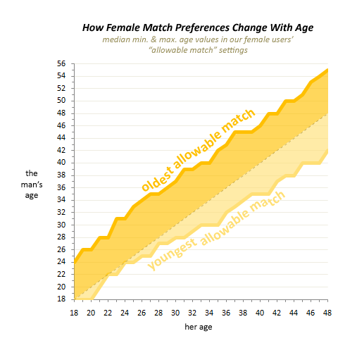 - Some of this may be up front decision making rather than personal One of the weirder downsides to online dating is the ability to set hard stops on certain characteristics of others. While in pre-computer days you would generally find out someone’s attractiveness first, now you can ask the site only to show you matches that are taller than 6’/older than 25/younger than 40, and the algorithm will do exactly what you say. This almost certainly impacts messaging behavior, and it turns out men and women approach ages limits really differently. OKCupid pulled their data on this, and here’s what they found: