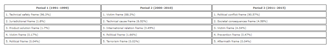 Even more interesting is that the authors did some analysis on exactly what these articles covered, to see if they could get some hints as to why the coverage has increased. They took 3 “eras” of reporting, and categorized the framing of the articles about the plane crashes. Here were there results: