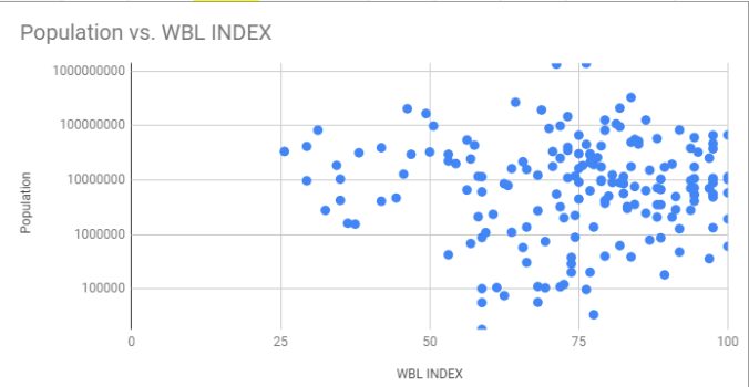 One final thought: it struck me as I was researching these countries exactly how big the US is in comparison. If you add up the populations of the 6 countries with perfect scores, you get about 96 million people. This is less than a third of the 325 million people who live in the US. Large countries tend to be less equal than small ones, and I do wonder how much of that is simply supporting a large and disparate population. The US is the third largest country in the world by population, and the first one with a higher legal equality score than us is #10 on the list, Mexico with 38% of our population and a score of 86.25. The next one to have a higher score is #17 (Germany) then France. To test my theory, I put together a graph of population size vs WBL index. Note: it’s on a log scale because otherwise China and India just kinda dwarf everything else.