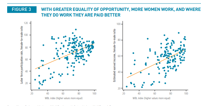 Now this struck me as interesting. Our biggest ding was in the one category where they also asked about men’s legal rights, i.e. paternity leave. In other words, the US got marked as unequal under the law because men and women were equal under the law, but in the wrong direction. I can see where they were going with this, but it’s an interesting paradox. I was curious about their justification for putting these laws up there along with the other ones, so I read the explanation they provided. From page 6 of the report: “Women are more likely to return to work if the law mandates maternity leave (Berger and Waldfogel 2004). Though evidence on the impact of paternity and parental leave is mixed, parental leave coverage encouraged women to return to work in the United Kingdom, the United States and Japan (Waldfogel, Higuchi and Abe 1999).” To note, this was the only criteria they included where they explicitly stated the evidence was mixed. Now as part of this report, the World Bank had stated that legal equality was correlated with equal incomes and equal workforce participation, and showed this graph to support its claim: