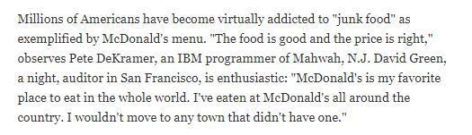 The article starts out pretty well, much the way an article about fast food would today, with this quote: