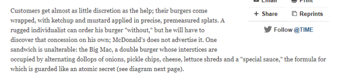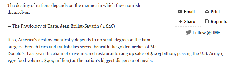 I was thinking about this again this past week, because our drive to NYC and back meant I ended up eating some form of fast food 3 days in a row. We even stopped at McDonald’s AND Burger King in the same 48 hour timeframe, which is something I haven’t done in a long time. It reminded me of an article someone posted on Twitter recently: a Time magazine feature on McDonald’s written in 1973.