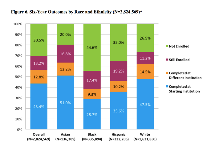 So what about the disproportionate impact claim? Well, that also came from the Chamber of Commerce report. More black students take out loans to pay for their education (77% vs a national average of 60%), they take out higher amounts ($29,000 vs $25,000) and are more likely to default on their loans within 12 years of graduation (50% vs 36% of Hispanic students and 21% of white students). However, it’s important to note that this is comparing graduating students to other graduating students….it excludes those who didn’t go to college or didn’t graduate. Those groups are also disproportionately comprised of minorities. Inside Higher Ed has a good graph of the outcomes by race 6 years after people matriculate: