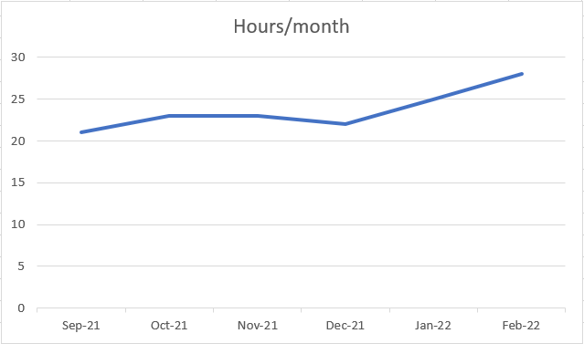 Also important, the amount of time I spend on this has actually gone up in the last 6 months, which proves this method is engaging, at least for me! Here are my hours/month since I started, not counting the hours I put in before I decided to go with this method: