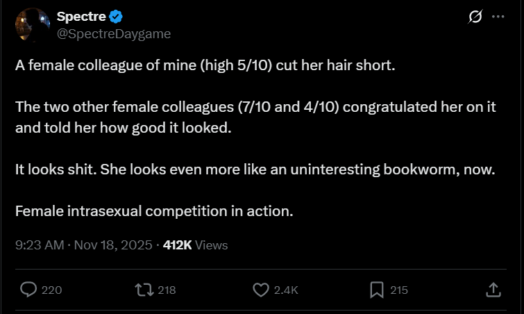 It actually came to my attention because a few people immediately pointed out that these women were in a no win situation: if they’d told their coworker “she looked like shit” they would be considered catty, but if they tell her it looks good they are intrasexually competitive. Additionally, they were coworkers of hers, not friends, and it’s pretty weird to expect that all women at all moments must be aiding every other woman they know with her appearance. I suppose there’s an option where they could have tried to be pleasant but not endorse the haircut, but that’s a very hard tone to hit correctly and honestly? I’ve also seen plenty of male coworkers say things “looked great” when other males came in proud of some new thing they did/purchased/whatever. Why start conflict with a coworker for no reason?