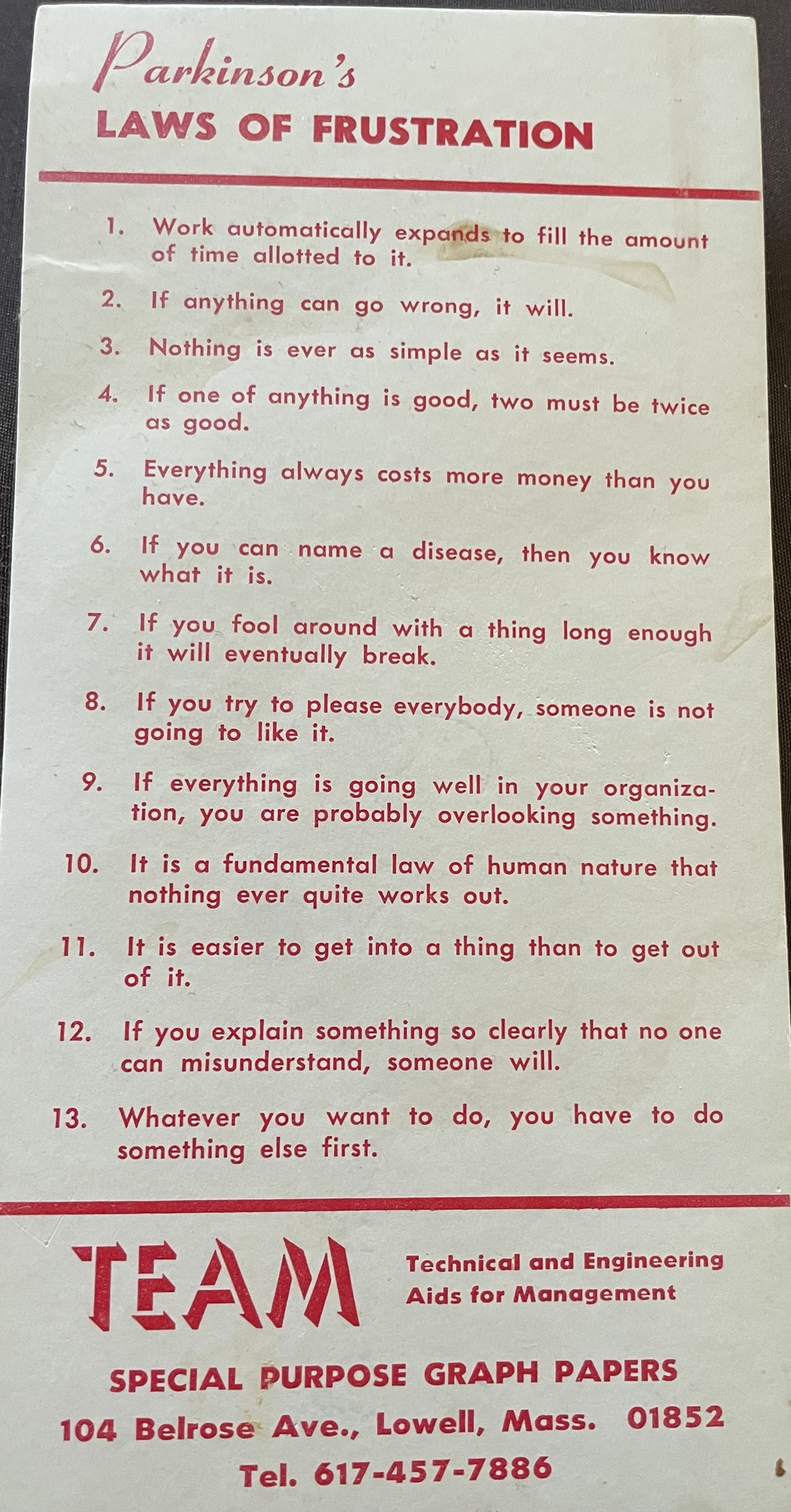 I fed this in to ClaudeAI to see if there was a source for this, and it told me the first one was in fact Parkinson’s law, but the rest were from other sources/unknown origin. Claude’s take: