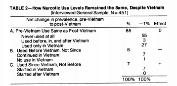 So basically 85% of soldiers returned to their pre-Vietnam status. 8% who had used before Vietnam actually stopped using after returning from Vietnam, and 7% who weren’t using before started using and never stopped.