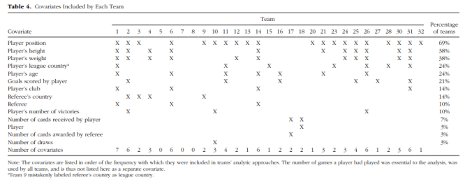While many of the teams updated their beliefs, it’s good to note that the most likely update was “this is true, but we don’t know why”, followed by “this is true, but may be caused by something we didn’t captured in this data set (like player behavior)”. - They key differences in analysis weren’t things most people would pick up on. At one point in the study, the teams were allowed to debate back and forth and look at each others analysis. One researcher noted that those teams that had included league and club as covariates were the ones who got non-significant results. As the paper states “A debate emerged regarding whether the inclusion of these covariates was quantitatively