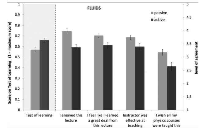 Now there’s a couple caveats with this study: it’s not clear what would have happened if they had tried this study on 4th year students who were doing more advanced work, or if they had tried this at a state school rather than Harvard. They also mentioned that the kids in the study weren’t given any warning about teaching methods up front. In a later version of the study, they spent a few minutes in the first lecture teaching kids about active learning methods and the proof that they help students learn more. The students subsequently rated those classes as more effective, and said they felt better about the learning methods.