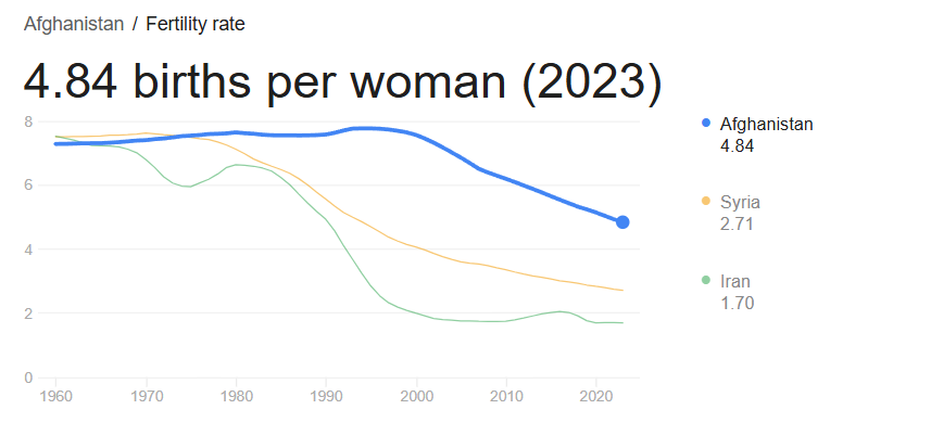 Now while these birthrates are higher than the US, it’s hard to miss that they are also falling. Even if one could overthrow the US and install Afghanistan style gender relations, it’s not clear that line would stop falling at all.