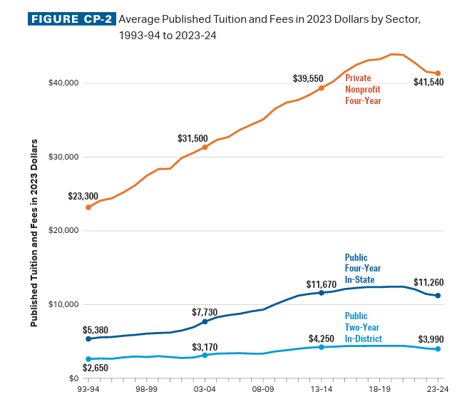 Additionally, technology improvements allowed online schools to start offering cheaper tuition at a large scale. This might have only made a small dent, except then the pandemic happened and traditional campus life was upended. This made the difference between going to a traditional college and an online college much smaller, and based on those I know with kids that age a lot of kids opted for at least a year or two at a cheaper online school rather than pay through the nose to sit in their dorm room all day. This put additional cost pressure on schools, and we see the prices tick down further.
