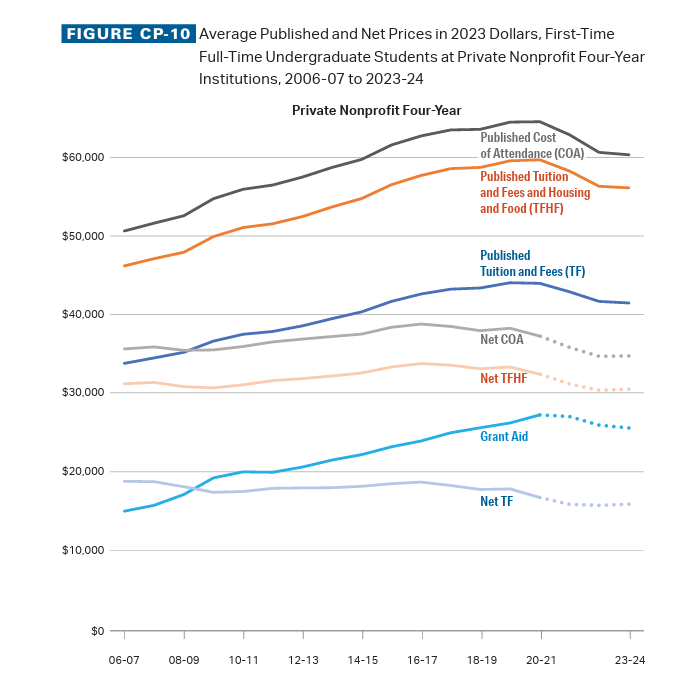 The above graphs are just the sticker price. The College Board also tracks the “real cost” after factoring in grants. Here’s the data for private 4 year colleges: