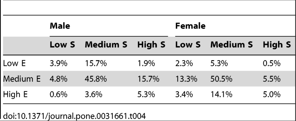 Well as you can see, just about half of people of both genders are actually moderate at both empathizing and systematizing. The population I was initially curious about, those low in both, are unusual but not unheard of…a little over 2% of women and just under 4% of men. People who are high in both are about 5% of each gender. There actually weren’t a lot of huge discrepancies on the diagonals here, where you see big differences is in things like the High S/Medium E combo (3 times more common in men than women) and the Medium S/High E combo (around 4 times more common in women than men). We see similar discrepancies with the Medium S/Low E category and the Medium E/Low S category.