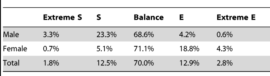 Here, “extreme” comes from having a large gap between EQ and SQ, it does not necessarily mean that one was the highest in E or S overall. As we saw in the data above, there are a good chunk of Medium S/low E men and Medium E/low S women. Having a gap does not connote hyper competence in either trait. There were also High S/Medium E men and High E/Medium S women, so the gap also doesn’t necessarily mean a deficiency either.